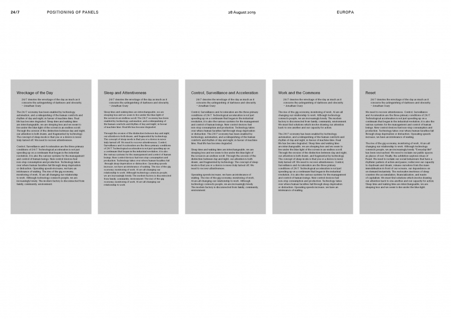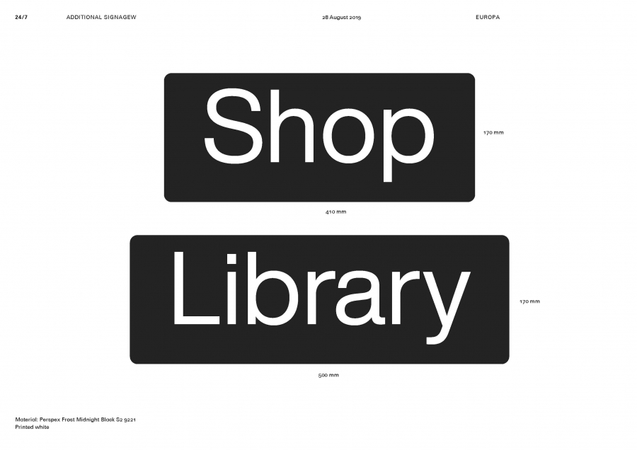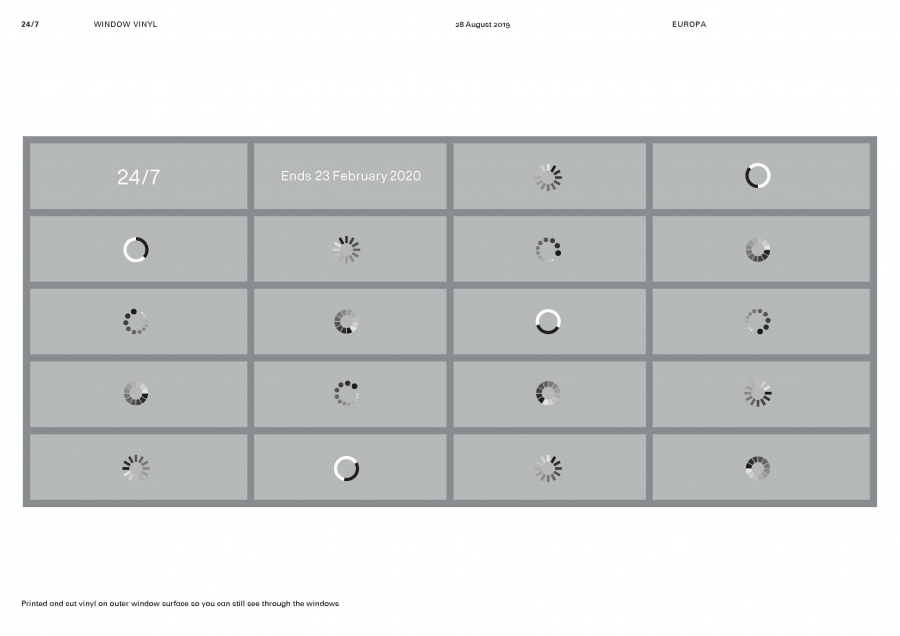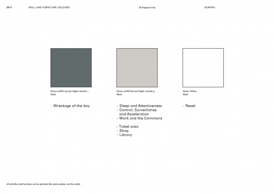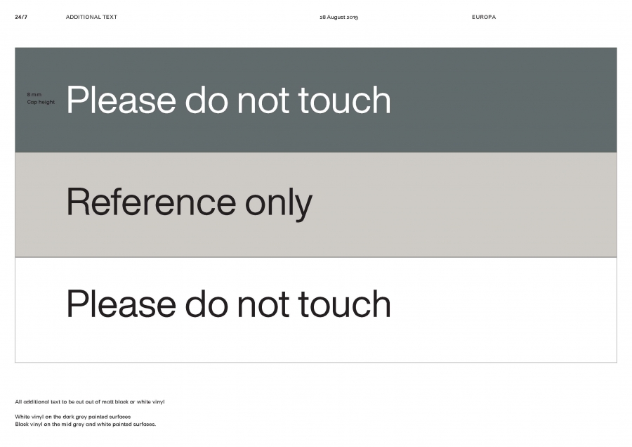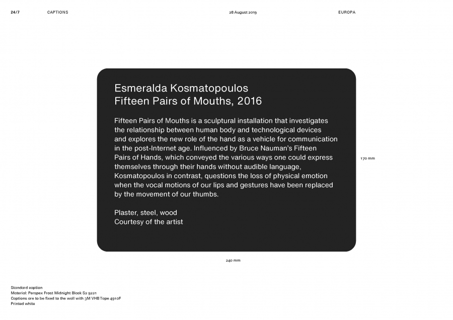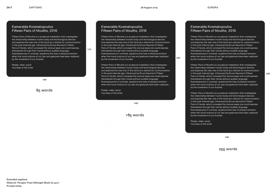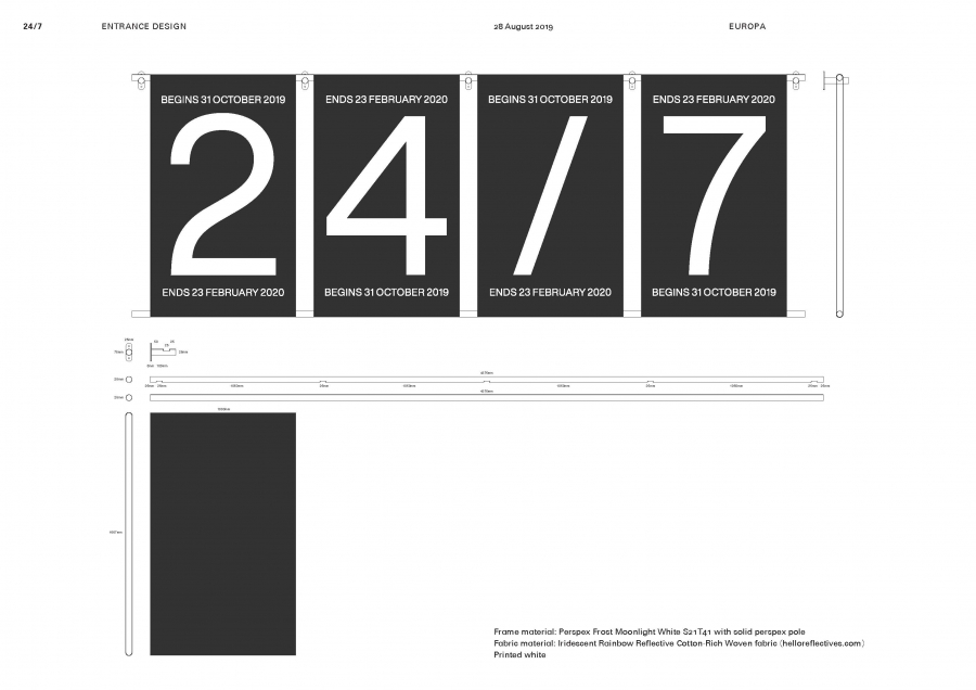 This section includes drafts and mock-ups of the proposed design feel and colour scheme for the exhibition, particularly the interpretation texts and object labels, as well as entrance graphics. Sarah Cook and Somerset House selected London design agency EUROPA (led by Robert Solis) and worked closely with them, and with the selected exhibition lighting designer Lucy Carter, to choose reflective materials to ensure the immersive night-time feel of the exhibition, and to make reference to the screen culture the exhibition critiqued.